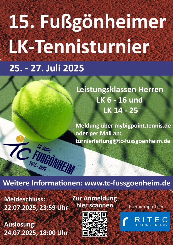 LK- Tennisturnier Liebe Freunde des TC Fußgönheim, vom 25.07.2025 bis 27.07.2025 findet das 15. LK-Tennisturnier in Fußgönheim statt.